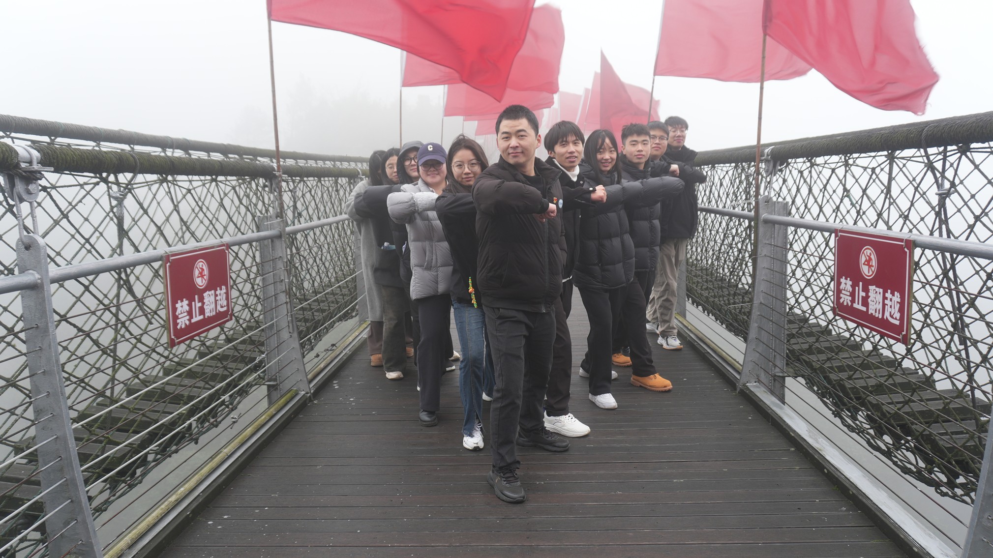 踏上长空桥,红旗漫卷西风。这座横跨百米峡谷的桥梁旁,便是红军当年踏过的悬空桥。行进间,历史与现实交叠,似见先辈浴血身影跨越时空,于雄关漫道延续信仰力量。师生过悬空桥,登西风台,俯瞰群山巍峨,“苍山如海,残阳如血”的意境尽现。大家不禁驻足合影,镜头不仅定格雄关美景与青春面貌,还凝聚起赓续红色血脉、践行初心使命的坚定信念。