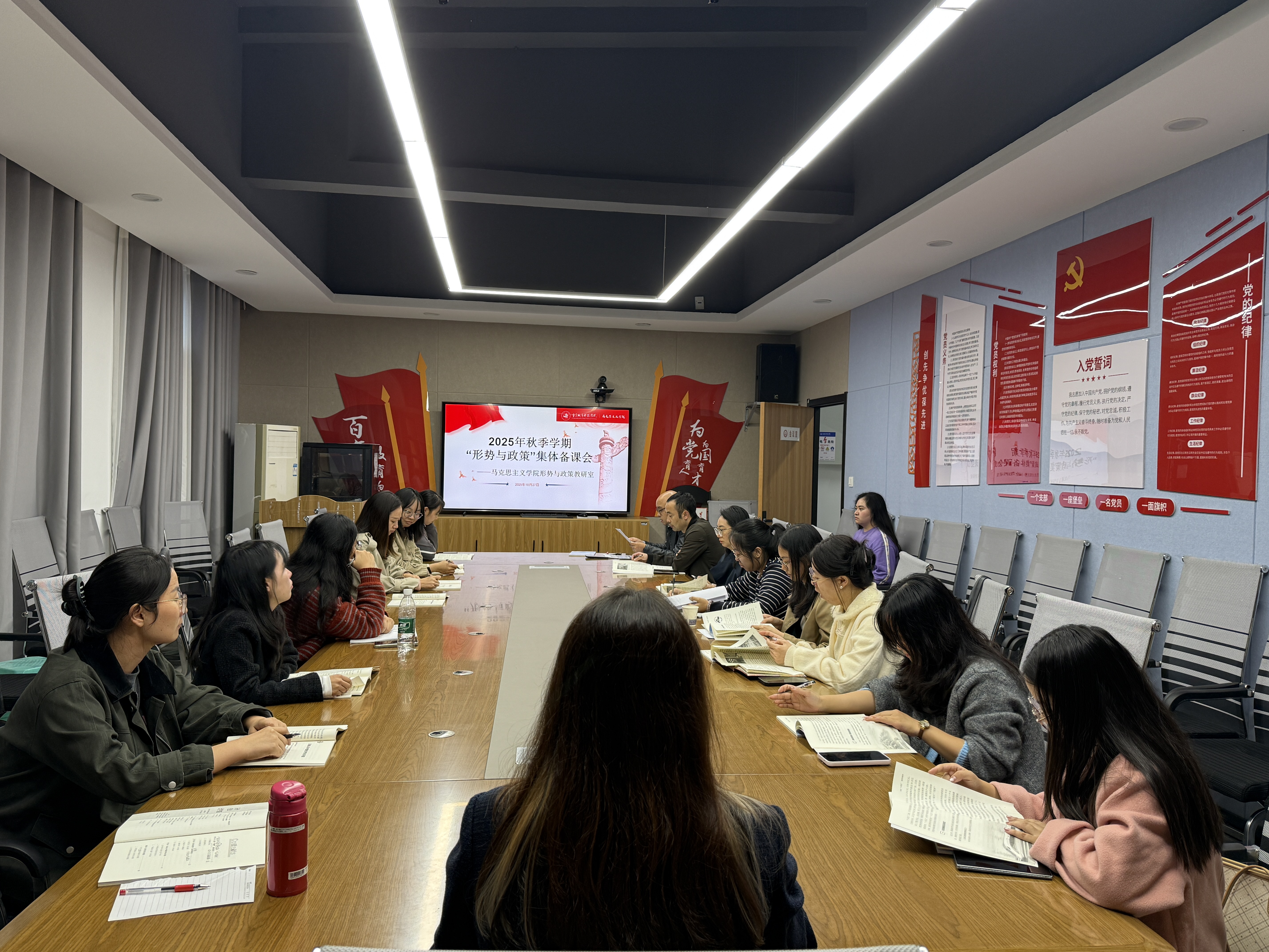 为统筹推进2025-2026学年下学期《形势与政策》课程教学工作,明确教学方向与核心任务,保障教学活动的规范性与时效性,10月29日,形势与政策教研室组织召开集体备课会。本次会议采用线上线下相结合的形式,教研室主任肖和平、副主任马千惠、全体课程专兼职教师共同参加。会议紧密围绕2025年秋季高校形势与政策教学要点、党的二十届四中全会精神学习贯彻为核心议题进行了深入研讨。