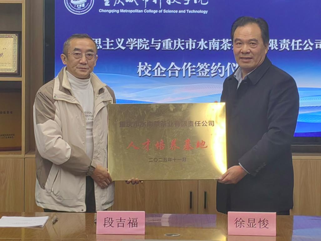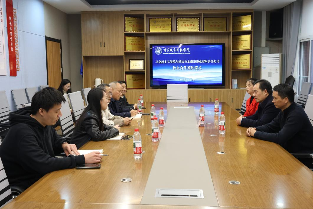 2025年11月12日,为进一步强加思想政治教育人才培养路径,拓宽学生就业渠道,马克思主义学院与重庆市南水茶茶业有限责任公司于马克思主义学院会议室进行校企合作战略协议签约仪式。学院院长段吉福、副院长张沙沙、思想政治教育系主任柳建国、思想政治教育系副主任张峻铭,以及学院陈胜婷教授出席会议,水南茶茶业有限责任公司董事长徐显悛及两位公司代表共同出席。