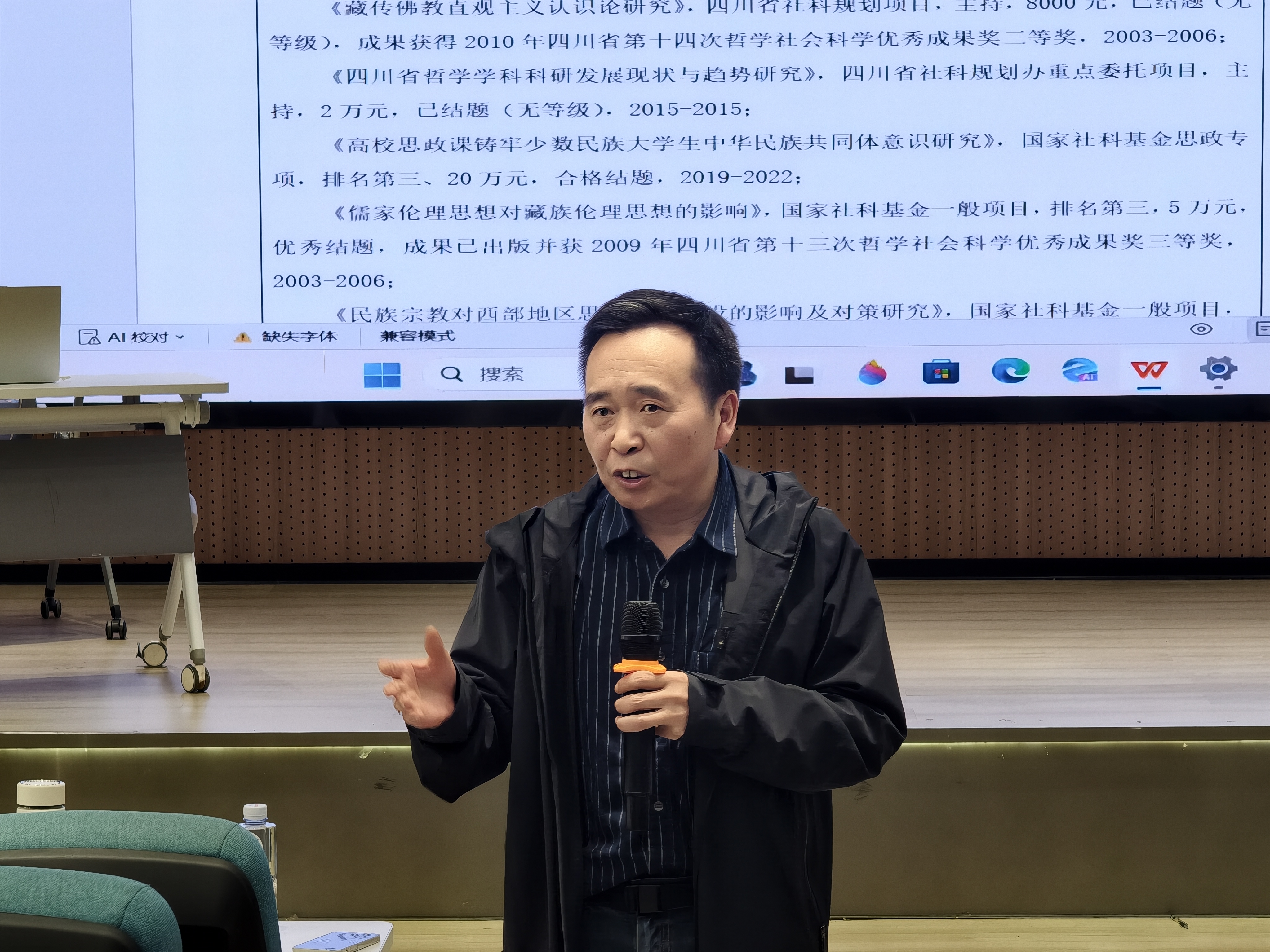 为提升教师科研能力,精准把握课题申报核心要点,助力学院科研工作高质量发展,2026年4月1日,马克思主义学院在求是堂举办第五期教师科研能力提升专题讲座。西南民族大学哲学学院李元光教授受邀担任主讲嘉宾,学院院长段吉福出席活动并主持讲座,学院全体专任教师参加本次活动。